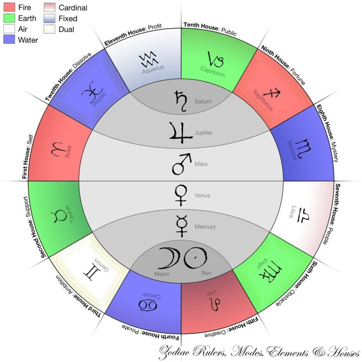 In any case, the qualities of each of these zodiacs and how we understand them very much reflects their patron luminary. The solar zodiac has structure. It is something we can reason about. What is the structure? Primarily it is the pattern of elements (Fire, Earth, Air, Water) and modes (Cardinal, Fixed, Dual). There is also a nice structure to the traditional rulerships. There is the consistent progression from Aries to Pisces, each sign expanding the scope of the previous and moving from birth to oneness.